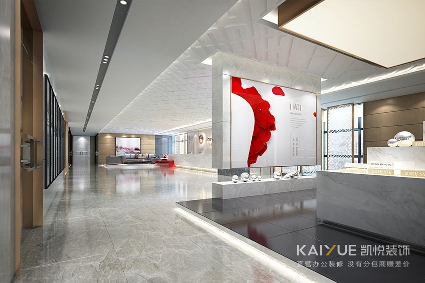 设计师在中盈的办公楼装修设计上保留了原有的特点,充分结合中盈盛达公司的企业文化,从LOGO图形中提取元素,将中国红作为点缀色,让空间在丰富的同时又能展示出企业的实力。线条间的韵律将自然元素连接,富有秩序感,立面设计采用了对称手法,休闲、稳重、大气,符合企业的气质与内涵。
