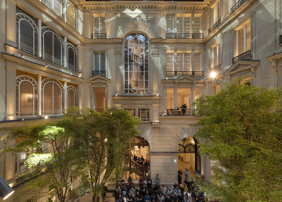 这栋历史气息浓郁的建筑似乎是从电影里拷贝出来的,有着古董珠宝的繁华,又有着说不清道不明的历史味道,设计师需要用新的事物去改变它,却又不改变它。庭院顶部有个万花筒状的采光天窗,它带来了绝美的光影,上方表面由光伏板覆盖,碎片合成后像一枚巨大的钻戒,通过阳光投射下来,光影斑驳,如金溪流淌。