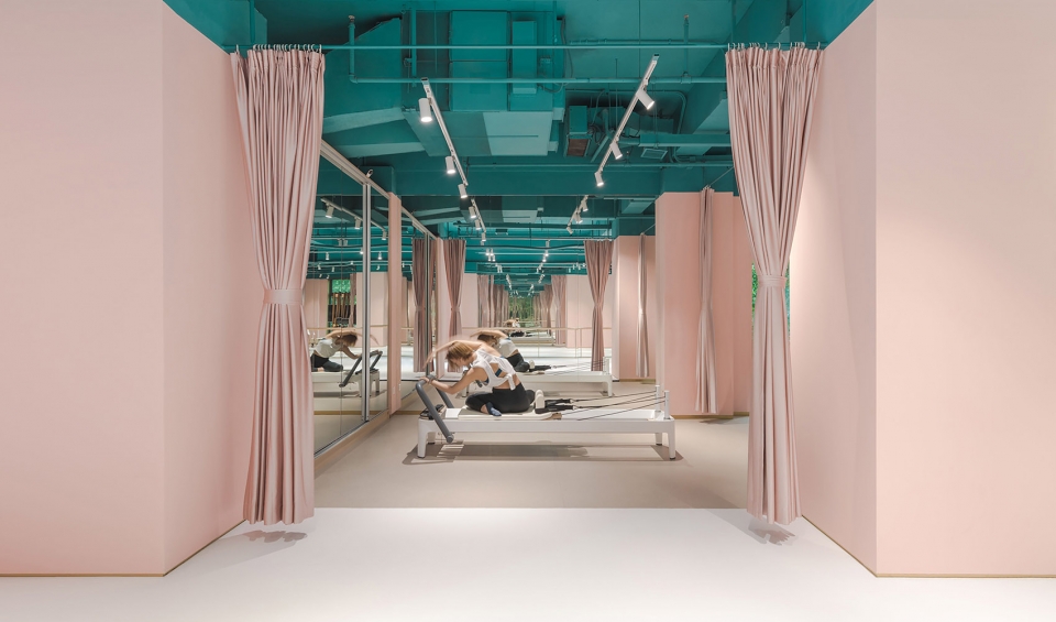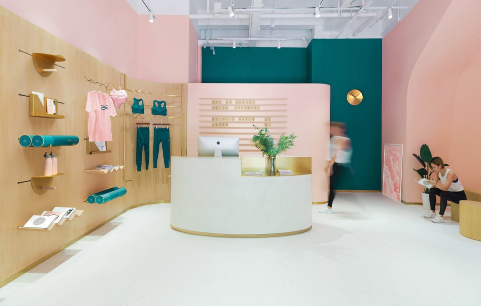 图中为上海的健身工作室品牌,他们希望在空间设计上展示当代潮流风尚的特质,但是还要拥有品牌所定位的高端气质,设计要将这些符号结合在一起,演绎成创新独具且有明确识别的整体。女孩子们对色彩和线条的情感反应是很敏锐的,从空间传递出来的情感和情绪,会影响人的感受,选择轻柔温和的粉色和绿色,能使人柔和宁静,直线代表平和和轻松,曲线可以代表柔美和性感。