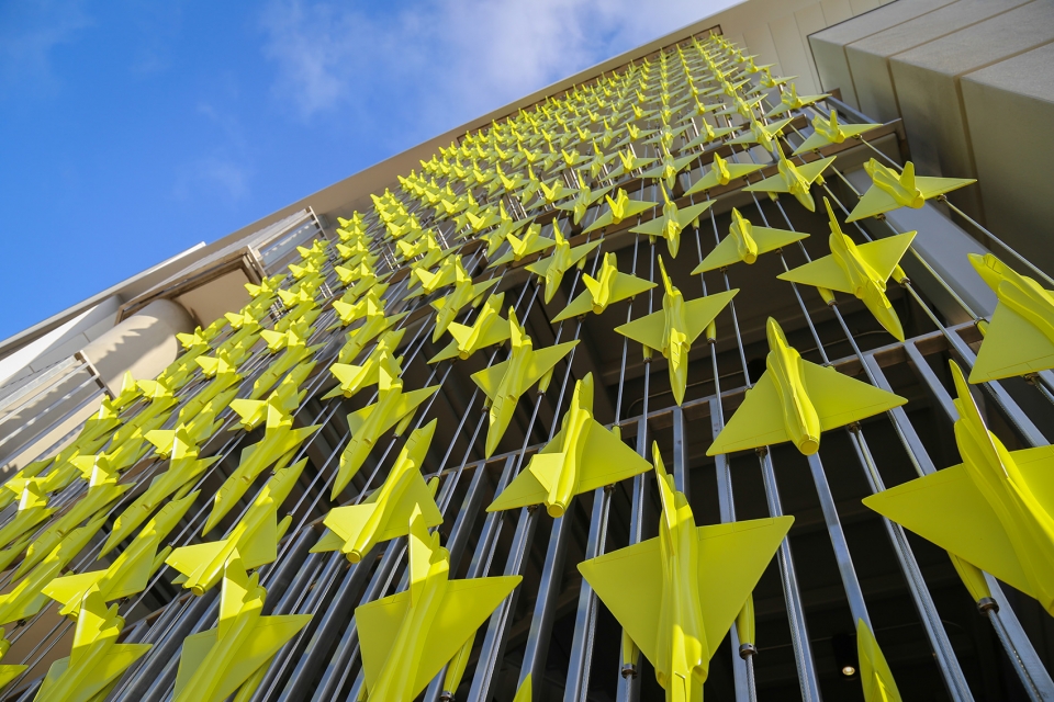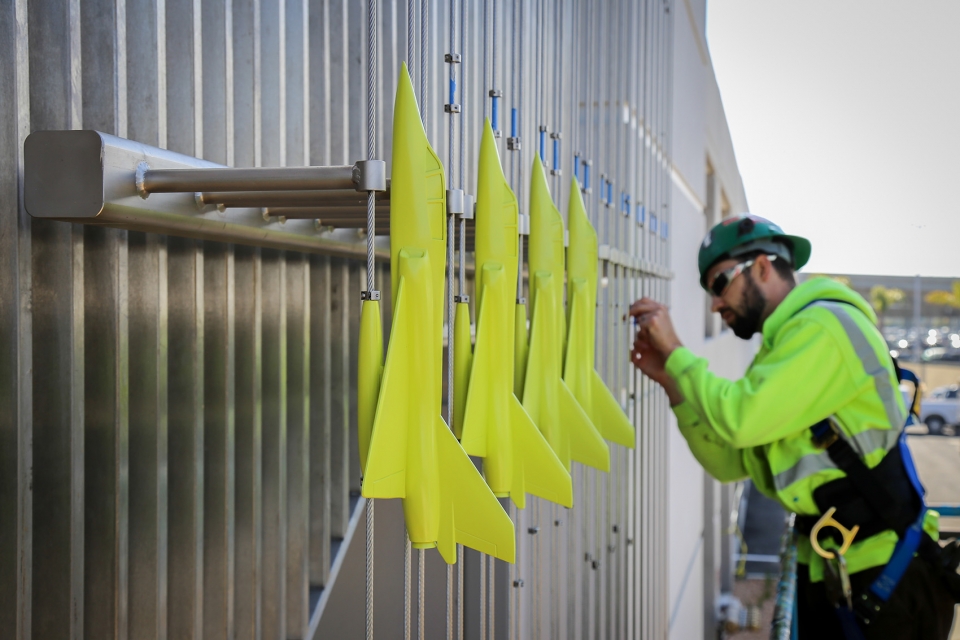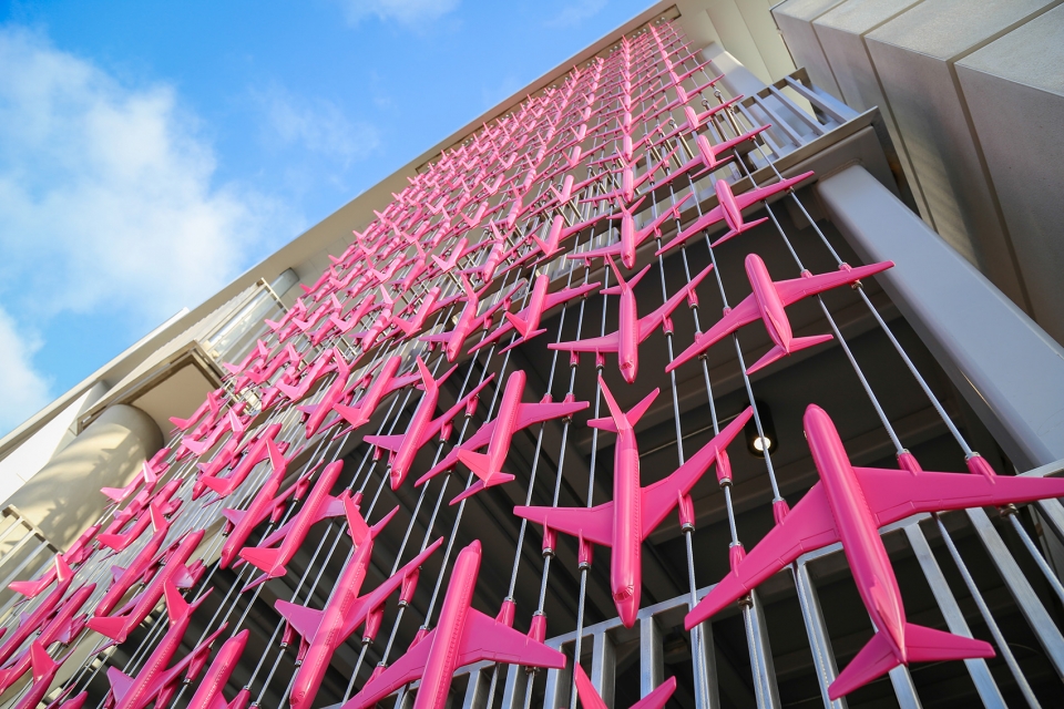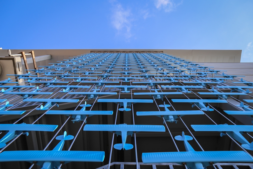 第一眼看到局部图时还以为是什么游戏,要做办公室装饰设计的可以来看一看,在室内做一片飞机阵队装置,绝对是个不错的创意,准备准备,飞鸭!介绍一下,这是圣地亚哥国际机场的装置,建筑外层由这些五颜六色的飞机群点缀,百家有趣,每张飞机跑道都是由数百个单独塑形的树脂飞机在航空钢索上串连成的,而且不同颜色的飞机代表着不同的型号,这可不是游戏,它代表着对未来的愿望呢。