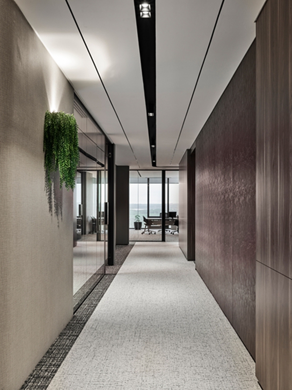为了体现企业的理念,设计师在办公室周围主要使用木材、地毯、大理石和玻璃材料,走廊周围装饰照明的一部分增加了绿色,显得整个办公环境简奢、雅致、自然、生机。