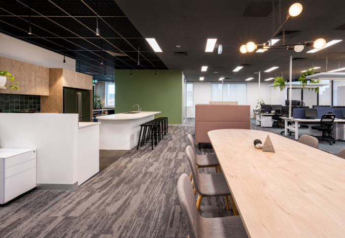 地毯是设计过程的重要组成部分,使用了不同的地毯图案和颜色来分隔空间区域,而不必架设过多的墙。设计师团队开发的另一项定制设计是悬挂在工作区上方的悬挂式隔音板,用于放置吊坠的植物。设计师使用的植物来自手工制作的花卉,这些植物都是令人惊叹的人造但外观逼真的植物。