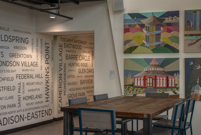 巴尔的摩的真实感觉被编织到办公室里,以讲述一个故事和荣誉,该组织每天都在推销“魅力之城”。泡泡糖粉红色的墙纸上点缀着柠檬薄荷棒的图像、带有大理石弯头的经典砖排房屋外墙以及专为城市中每个居民区建造的墙,都是对这一荣誉的致敬。