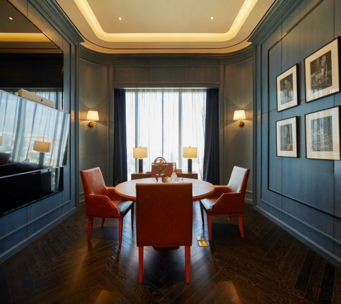 优雅的大门通向私人会议室,每间会议室都讲述着不同的设计故事。每个房间都是根据客户的性格和要求创建的,配有标志性家具、定制地毯以及颜色和图案、纹理和饰面,这也反映了该银行的历史相关点。#现代生物科技办公室装修#