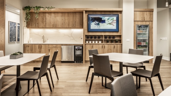 举办活动、举行私人会议和提供款待的灵活性是该办公空间设计的关键。折叠玻璃隔墙完全通向欢迎休息区,设计师提供的会议桌营造出高档的会议室外观,但提供了充分的灵活性,可以转换为培训桌或折叠和嵌套,可随时调整且不占用空间。