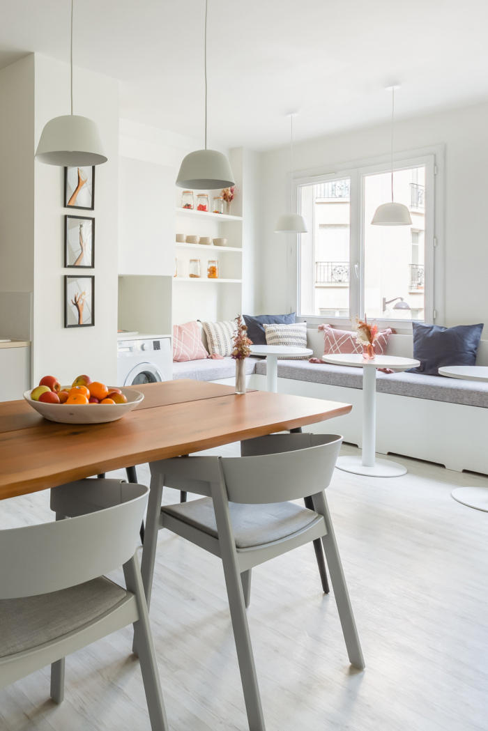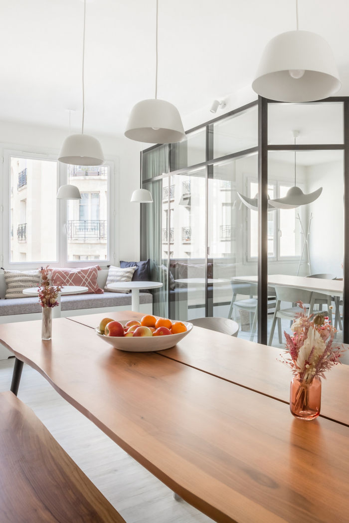 团队可以享受到全新的午餐区,配备定制厨房,以及简约、实用且优雅的家具。就像在家里一样,该场所是人性化的,并适应员工的日常需求,因此团队感到被重视,并在有利于福祉的领域积极发展。