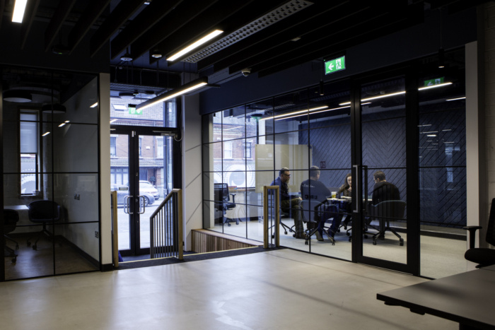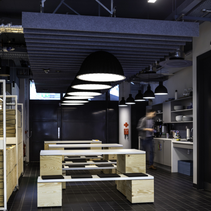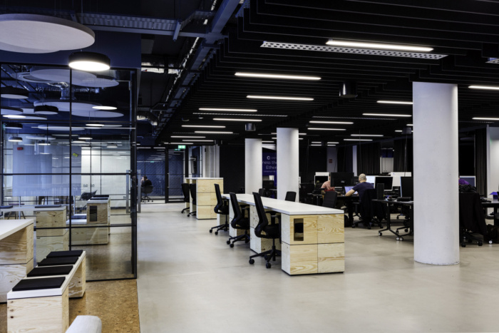 其办公室设计装修具有工业风格,色调以黑色、深蓝为主,光影结合,用圆形元素柔化空间,营造一个高效、静谧的办公环境。每个办公桌和工作区都特色定制,以满足任何个人对坐、站、协作等的偏好。
