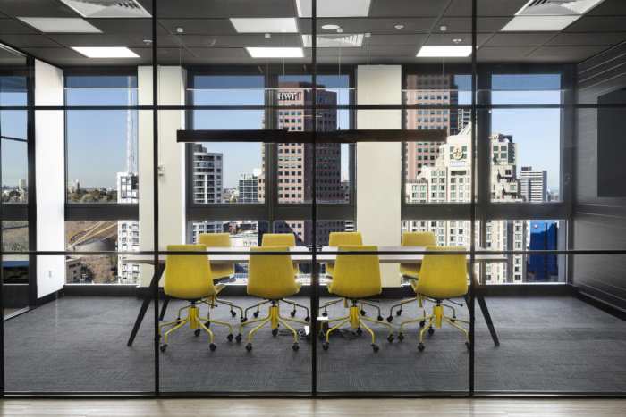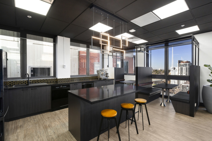 工作场所的文化和连通性很重要,因此设计具有多个休闲会议区和一个大型休息空间,鼓励员工离开他们的工作站并进行协作互动。设计师以黄色和黑色的配色方案呈现主题,为空间增添了活力,与别致的黑色天花板相得益彰,并配有创意矩形吊灯。最终的结果是,打造了一个给客户和员工留下深刻印象的空间。
