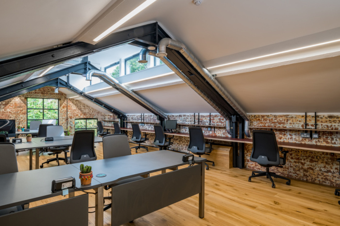 位于原始倾斜屋顶下方的第一层空间被设计为一个更安静的空间,配有固定和分配的办公桌。地板采用木材制成,后窗采用黑色框架和临界风格,与底层的窗户和分隔墙相匹配,侧壁和大部分前后墙都是喷砂砖,再次庆祝原始建筑结构。#写字楼办公空间设计装修#