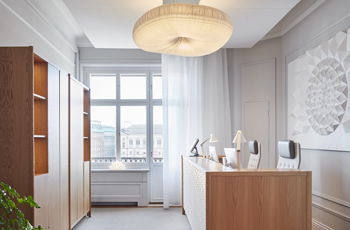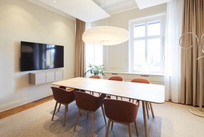 精致的细节与较重的橡木和实木材料形成鲜明对比。如今,占地1,800 平方米的两层楼包括60个工作场所,这些工作场所的特点是自然风光、传统工艺和现代设计巧妙结合。#高端办公室装饰设计#