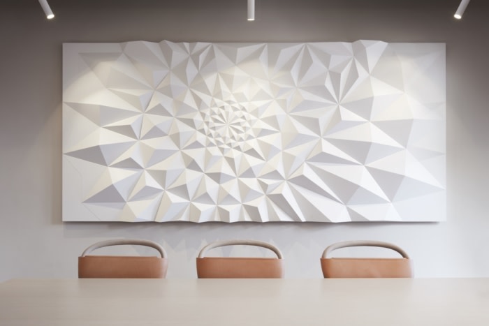 具有折纸感觉的图形艺术与纸灯、纸状窗帘和由薄金属网形成的表面相结合,以类似于纸的结构和美感。