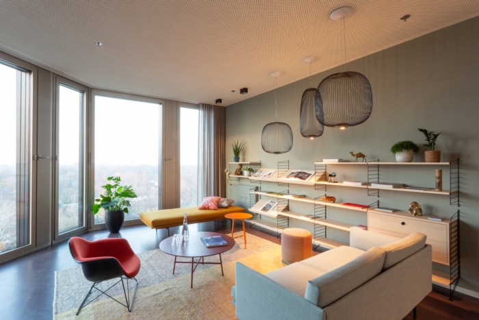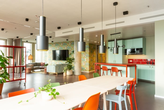 新空间相应地活泼多变,非常不同的工作区域已经整合在两层楼上。休息室、现代团队区、开放式会议区、智库和用于头脑风暴的创意空间、带沙发、躺椅和隔音窗帘的安静房间——员工可以根据工作阶段选择不同的设置。整个设计由小巧的配套配件以及良好的可持续材料和家具组合而成,室内设计团队有意将不同的纹理并置,并结合多彩和极简元素。