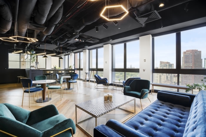 每个工作环境都由单独的品牌颜色定义,茶色和黄色用于突破,蓝色用于工作区,橙色和黑色用于酒吧和社交中心,带有不对称的符号元素,也与企业品牌标识有关。#办公楼写字楼装修#