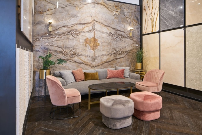 设计师用极简主义细节装饰的混凝土天花板成为了空间的中心特征。最后,咨询亭被放置在房间的中央,以传达开放性和可用性的信息;这与指导接待台设计的原则相同,这是一个由木头制成的低矮结构,邀请客户进行咨询。