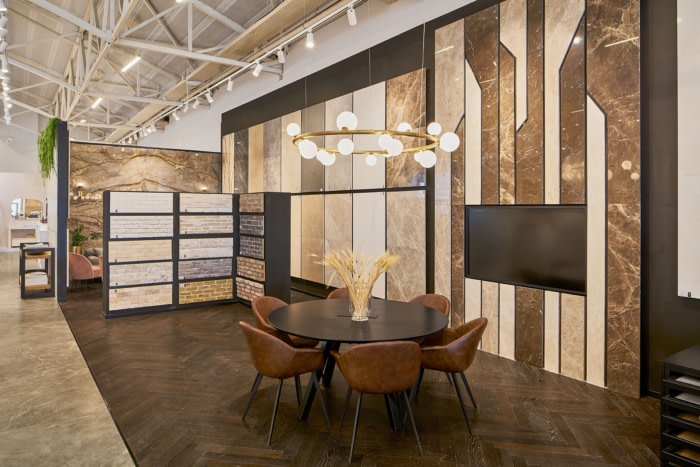 尽管展厅里展示了许多产品,但企业工作的主要目标是为参观者创造一种开放和愉快的感觉。出于这个原因,设计师决定只使用黑色、灰色和白色,并避免在入口处设置高大的展示墙,而是将它们放在后面,以便可以看到房间的全景。#高档办公室装修#