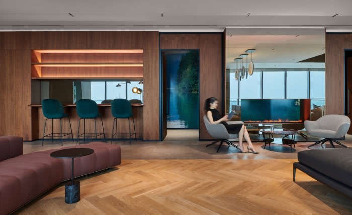 会议和董事会议室的玻璃创造了一个画廊风格的走廊,提供不间断的视野。带有弧形拐角的烟熏玻璃正面可以反映城市风光。从会议室内部,一个定制的青铜盘绕雄鹿雕塑藏在走廊的角落里,监督着商业交易,也象征着人类对自然的影响。