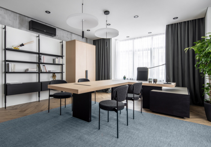二楼办公室的设计采用白色调色板。有时,白色会被木板和栏杆稀释,从而产生一些墙壁动态。强调简约的灯光赋予空间韵律。在桌子附近,有玻璃板,由于其镜面效果,使空间更深。#高级办公室设计装修公司#