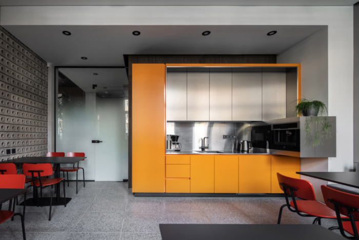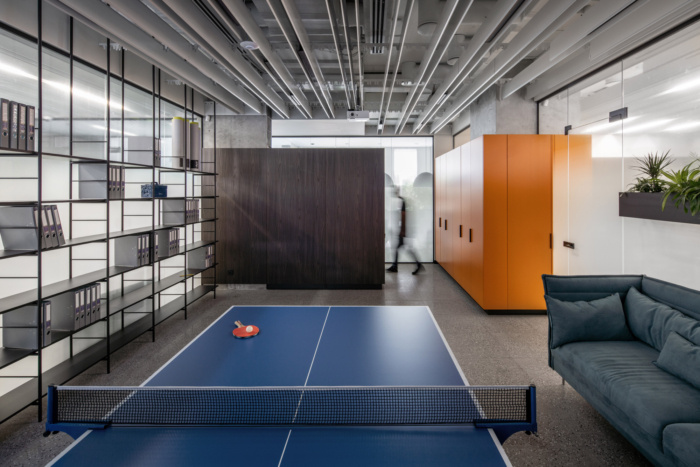 橙色的盒子离开走廊,进入报告厅,回到柱子后面的办公室,仿佛用一条明亮的品牌色线将各个地点连接起来。演讲厅可以根据情况和目标轻松改造。该空间的永久形式是一个带网球桌、图书馆和休息区的娱乐室。
