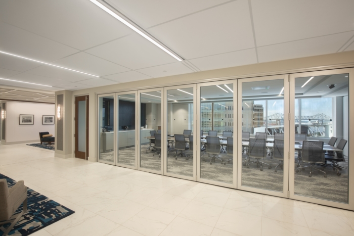 宽敞的主大堂和办公室采用暖灰色调,灵感来自附近路易斯安那州议会大厦的金属制品和石灰石外墙。为了向 1930 年设计的摩天大楼本身致敬,装饰艺术风格的照明、地毯、图案和建筑细节赋予空间永恒的精致。垂直胡桃木面板与以石材为灵感的地板和定制金属屏风形成纹理对比。玻璃幕墙充分利用了高处的位置,有助于为室内注入自然光。