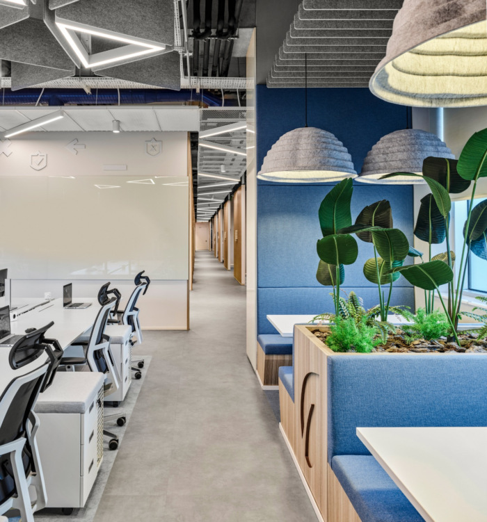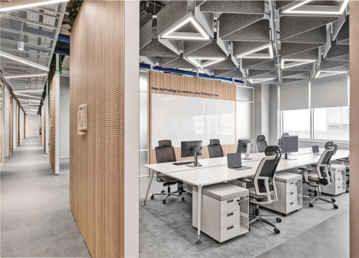 隔音在开放式办公室中极为重要。为每个团队保留的特定枢纽的天花板采用“Feltouch”生产和实施的定制声学元件设计。在墙壁上,我们使用了“Heradesign – 木丝”声学解决方案。