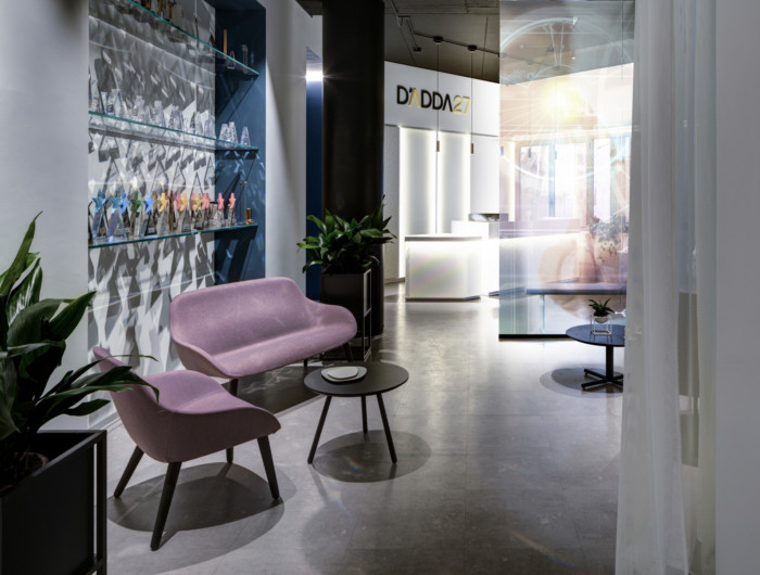 签署的该项目的主旨是使用透视错觉,使用色彩在内部对比之间创造路径,以“有形”的轻盈为名,几乎强调了实质沟通背后的创造性工作的具体性。从迎接我们的大厅有一张长长的白色照明和几何形状的背光穿孔金属板办公桌,通向该机构的会议室、办公室和 Buvettes。#办公室装修设计公司#