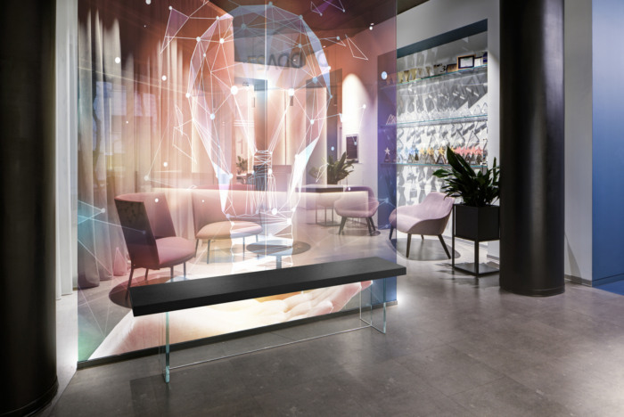 这两个区域实际上是通过一个大的、背对地的透明玻璃窗来区分的,由于特定投影仪允许的全息效果,令人回味的图像和空灵的图像在玻璃窗上交替出现。天花板、墙壁和大柱子都涂成黑色,以对比增强光点和屏幕上的投影。
