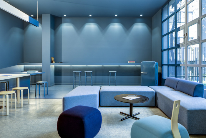 回到大厅,一条走廊的墙壁被漆成蓝色,角落里的霓虹灯以新概念主义艺术家彼得·哈雷的画为灵感,引导我们穿过紫红色的门到达办公室的开放空间。在这个区域,颜色被用来构建一条视觉路径,从走廊的黑白到红色的门,再到一个大房间,白色的阴影加上重要的蓝色。