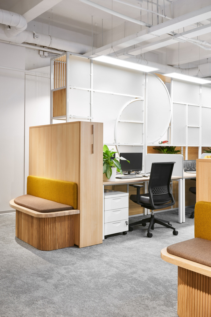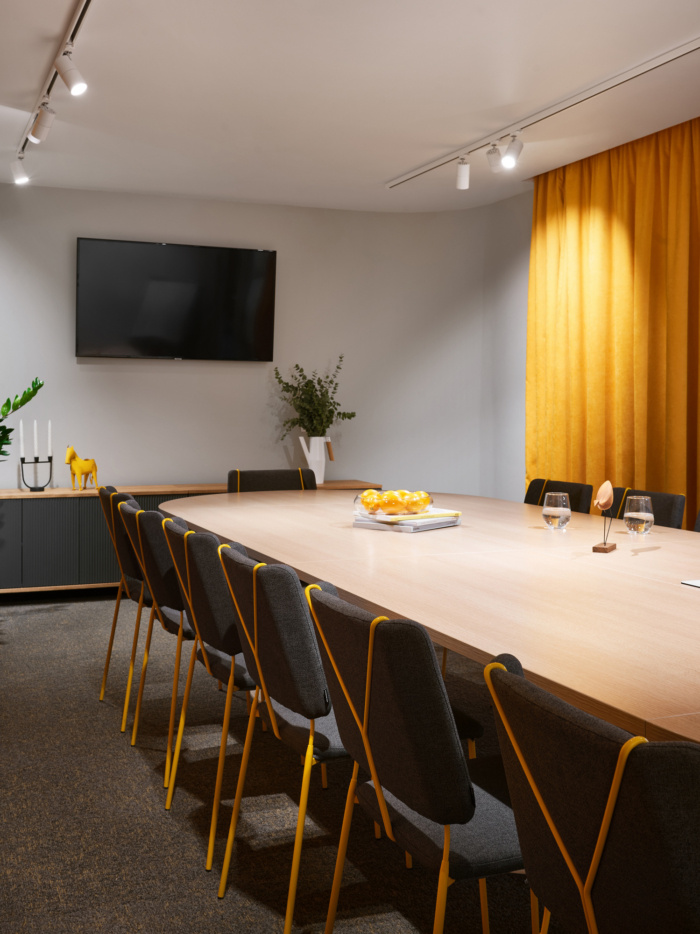 在办公空间规划的中心位置有圆形的会议室,将开放空间分成两个翼,室内设计的主要颜色是黄色?;嵋槭仪奖谟懈粢籼畛湮?,隔音窗帘完全阻隔一切噪音。大约50个工作场所位于工作区。每个工作场所都有桌面隔音屏,部门之间由楼层高的移动隔断隔开。便利的内置座椅和桌子位于过道沿线,可让您舒适轻松地使用笔记本电脑工作或与同事交谈。#广州设计公司#