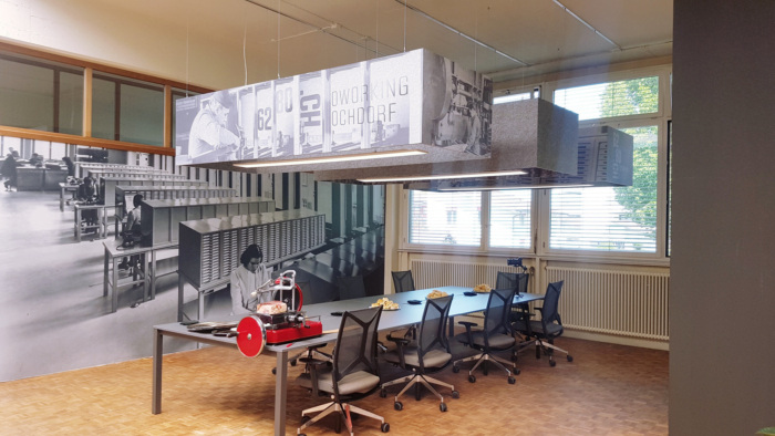 个别办公室根据当地濒危植物命名和设计。考虑到亲生态方面,大部分空间都用植物装饰,比如枢纽后部安静的焦点区域,木制办公桌隔板顶部是植物,墙壁图形反映了与瑞士奶牛贝尔塔一起监督活动的山地牧场。