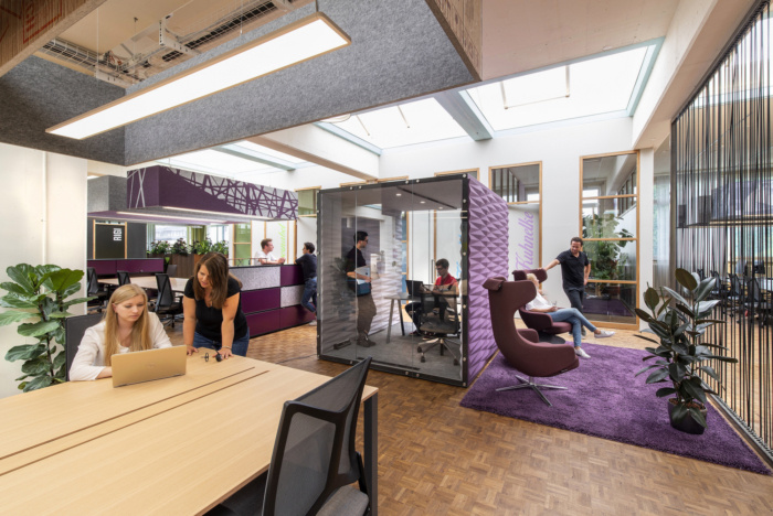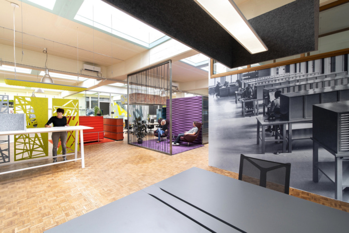 除了开放和封闭的联合工作区,还有电话亭式的私人工作空间、更大的团队工作展位和一个用于工作坊或产品展示的亮黄色创意空间。房间由玻璃隔断墙分隔,并配备大型触摸屏和便携式家具,以实现最大的灵活性和创造力。