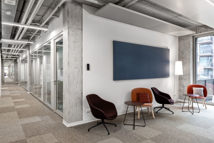 在四个多空间楼层上创建了许多团队空间、开放式交流和集中区域,以提供满足员工不同要求的灵活工作选择,这些新的工作场所模型由具有工业特色的建筑构成。高比例的裸露混凝土和开放式技术装置突出了这种设计。充满活力和活泼的色彩组合搭配各种舒适的家具,邀请人们流连忘返并交流想法。#广州室内装修设计#