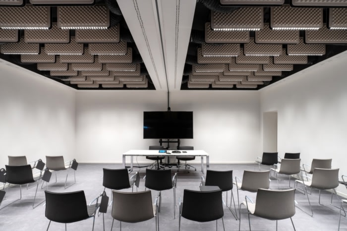 正是出于这个原因,建筑师选择使用双层玻璃墙来分隔房间:一种简单的工具,可确保工作场所的声学规范的一致性,同时也向整体构图传达美学价值。由于自然光透过大窗户,可以欣赏到建筑物的深度以及画廊和非正式区域等大空间的重叠,这些空间的特点是空灵元素和绿色墙壁。