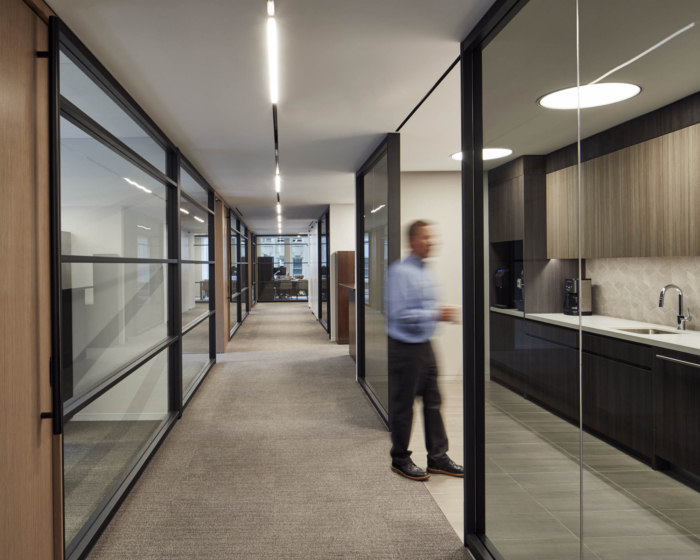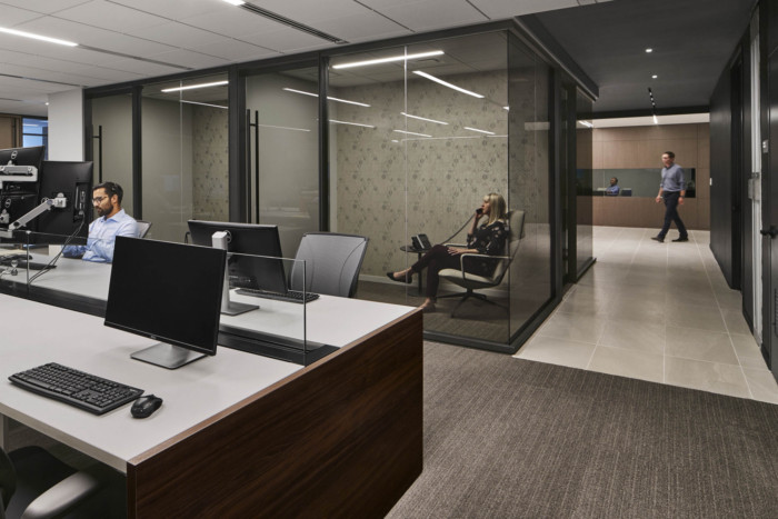 入口处是由坚固的石灰华石制成的接待台,背景是黑色木板格栅。配备高端家具的办公室,以及大小会议空间、开放式工作空间和隐私电话室,排列在空间的周边,结果是一个豪华、精致的工作环境。#办公室装修公司#