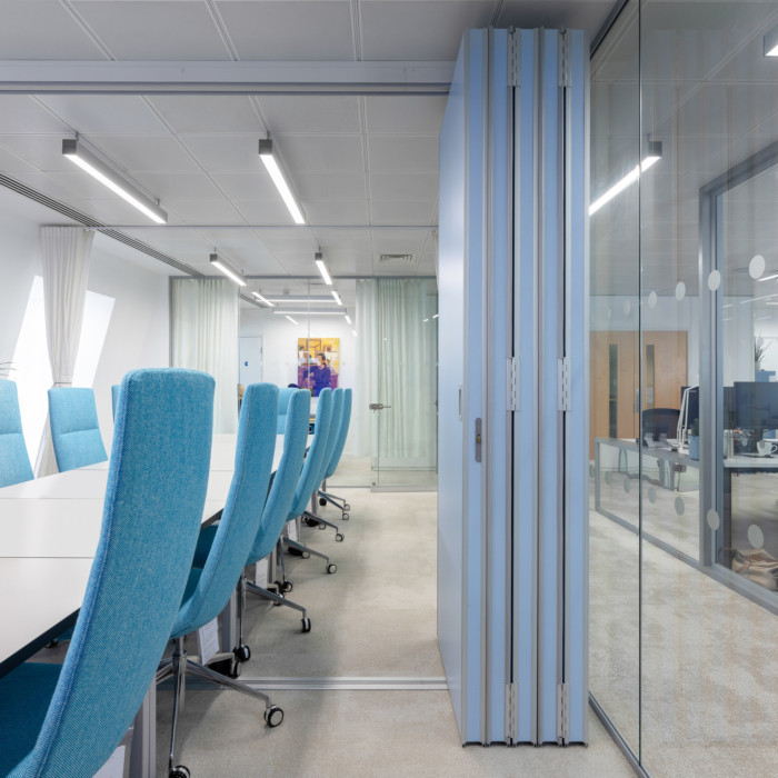 整个玻璃或镜面隔断最大限度地提高了空间感,而办公室空间中元素的方向和设计则最大限度地利用了日光。几乎所有元素(窗帘、隔板)都是南北走向,以保持尽可能多的北极光。尽管存在明显的矛盾,但这些策略同时实现了开放性和隐私性。