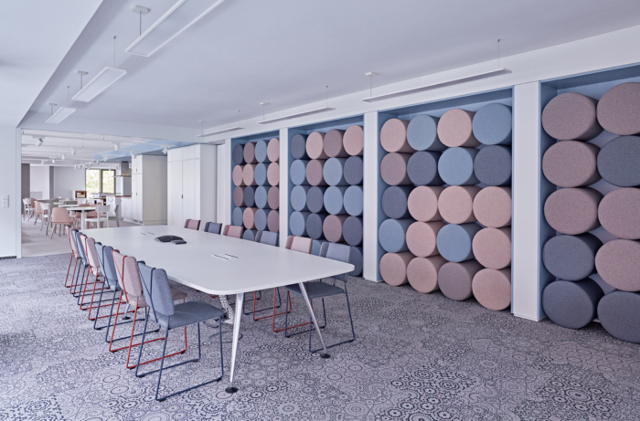 设计理念与企业各个实体的 CI 颜色保持一致,并将它们结合在松散的家具和室内装潢材料、地板饰面和墙壁织物中。