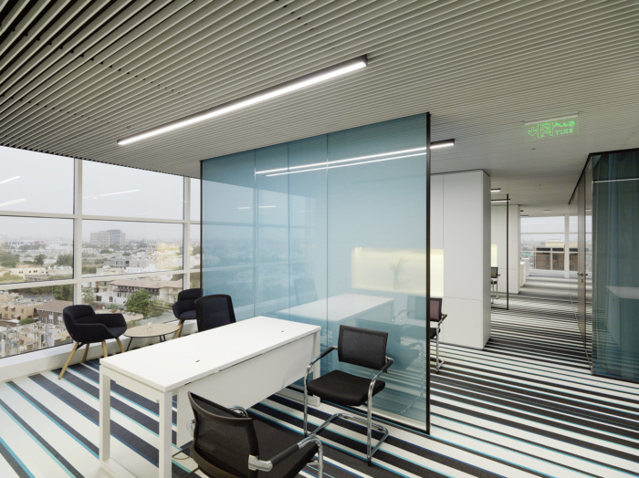 各种单品,彩色玻璃立方体创造了一个带有小巷和广场的村庄般的结构,可以促进和增强人们的互动,同时提供隐私和专注的空间。它的结构设有会议室、祈祷室、自助餐厅、游乐场、开放式会议空间和其他服务设施,由开放的工作区线包围,位于窗户的两侧。为所有员工提供户外景观,工作区设有私人飞地,组织开放空间并为电话亭、媒体亭和创意或非正式会议提供多种功能。