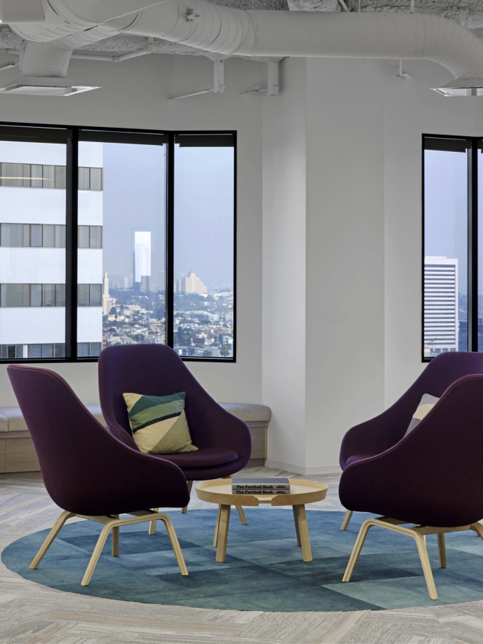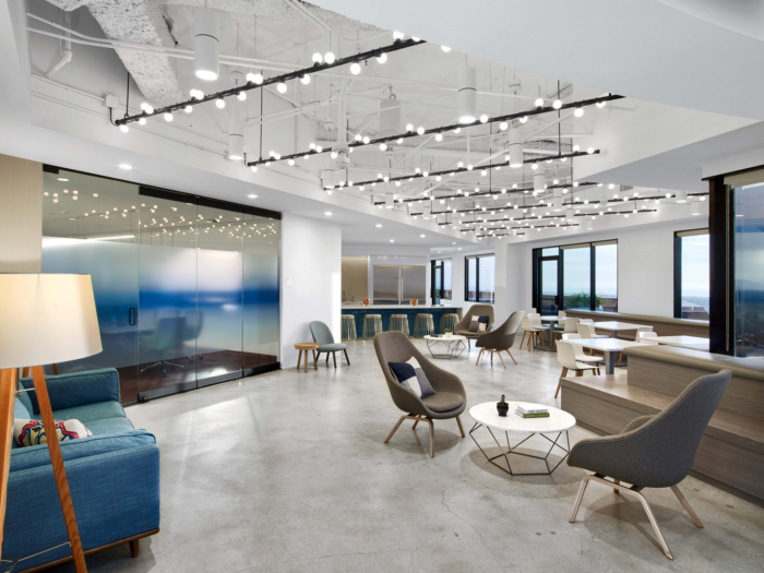 随着周边办公室的拆除,地板现在可以利用城市的360度全景,这激发了好莱坞山柔和的绿色和风化的树林、海洋的蓝色和早晨凉爽的淡紫色光芒的调色板城市上空的日出。它们相结合,为空间呈现出柔和舒适的西海岸风格背景。#办公室装修公司#