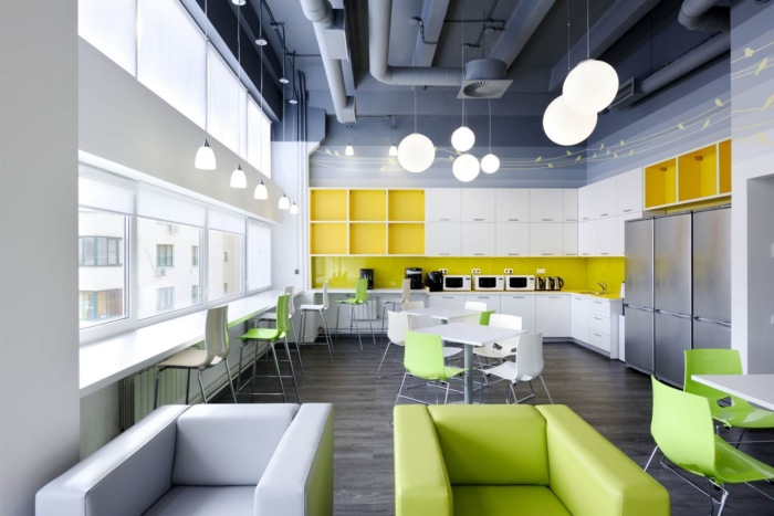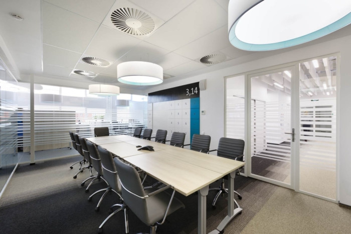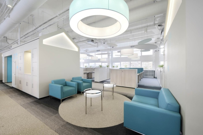 灰白色的吸音板和圆柱灯形成了员工友好的声学环境