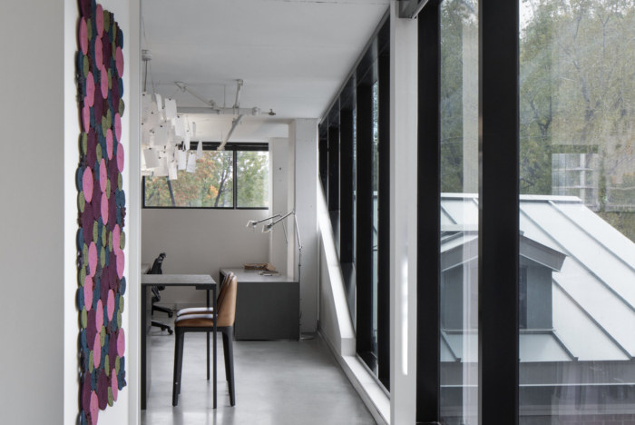 远处,一扇巨大的玻璃门后面,是明亮的会议室,全玻璃墙俯瞰着内院。循环和光从一端到另一端穿过这些空间,没有障碍。