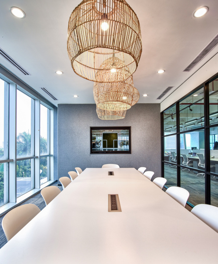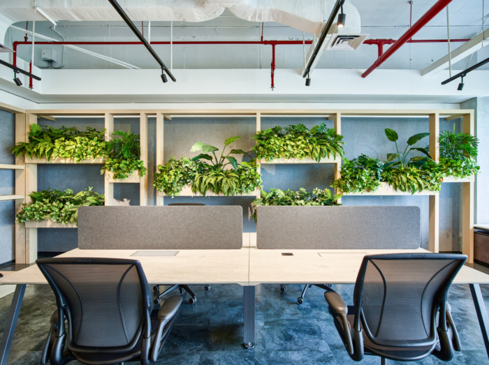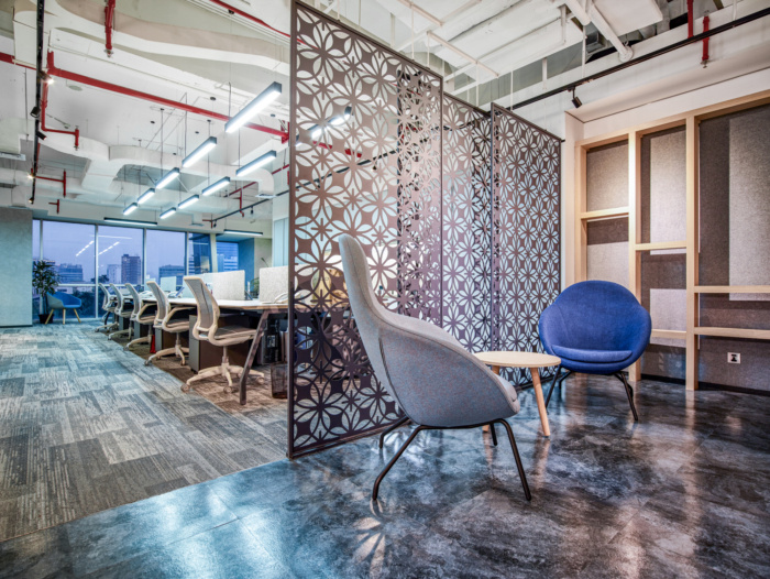 整个空间中使用的原始和自然饰面和纹理,如水泥、木材、毛毡和金属,传达了诚实、真实、工艺和人性化的方法。未来派特色标牌墙欢迎参观者,其标志以黑钢、LED 灯和苔藓作为背景重新诠释。陈列室和办公区相互连接,然而,带有传统印尼剪裁图案的屏风创造了一种隐私感。#办公空间设计#
