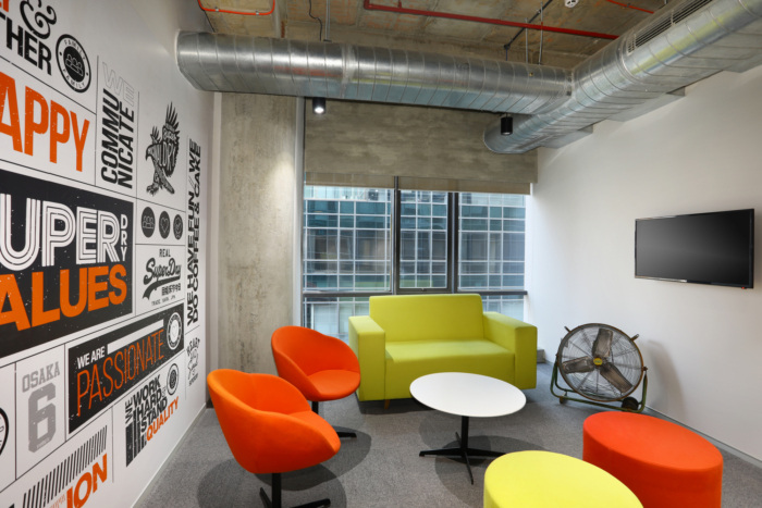 这个办公室令人惊叹的因素是原始和工业外观,它贯穿整个空间。接待区拥有未加工的混凝土饰面墙壁和地板,配有复古皮革沙发,与卧铺木家具相得益彰。裸露的天花板和工业灯丝灯具与外观相得益彰。一个有趣的因素是休息室会议室,它具有与整个办公室不同的现代感和现代感,黑白壁画突出了霓虹色沙发和明亮的躺椅。