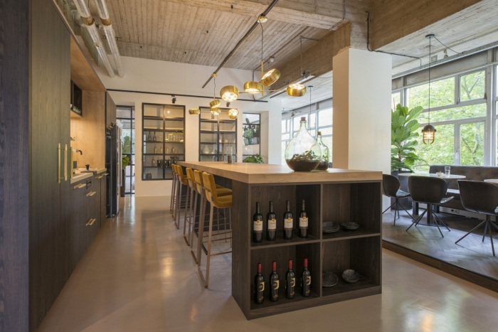 办公室的中心是厨房和休息室,这是与他人进行更多休闲会议的好地方。这是一个很棒的现代办公室,以暖色调作为对比。展示柜是用原钢定制的,它与其他隔墙配合得非常漂亮。