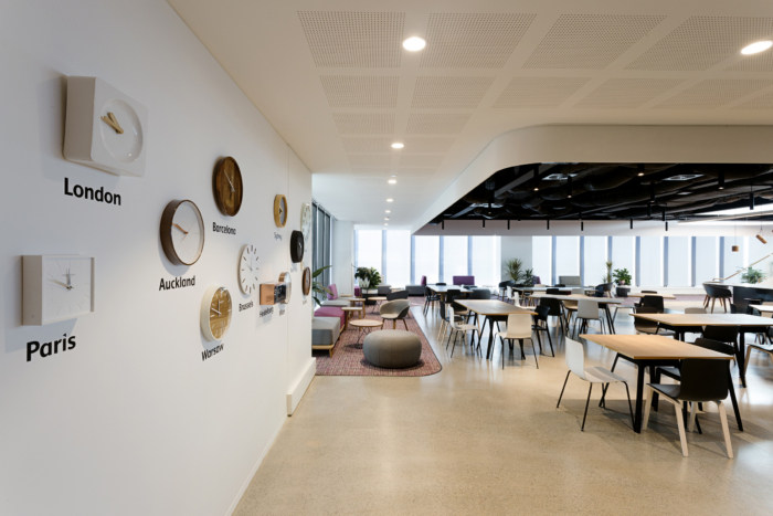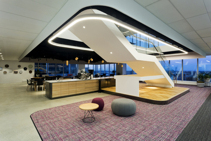 他们的天花板设计展示了一种注重细节的创造性方法。休息室设有开放式天花板和黑色外露服务,以减少视觉混乱并产生空间感。而接待区和会议室区域的天花板同样具有创新性,包括对其标志的三维诠释。
