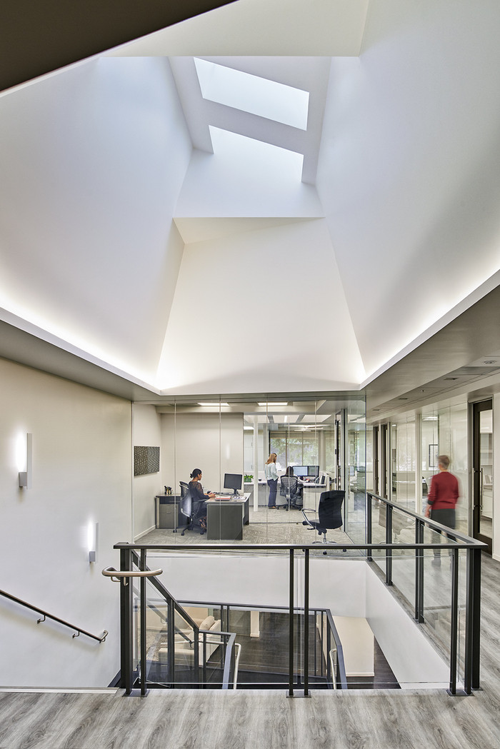通往二楼的通道是位于引人注目的天窗下方的光滑中央楼梯。新楼梯由透明玻璃板和定制金属栏杆构成。玻璃前的私人办公室与开放且日光充足的咖啡吧共享空间,邀请用户参加快速的触摸式会议以及周五的比萨饼和酿造。现代建筑元素,金属元素和玻璃跨度,为现代色彩丰富的艺术提供了完美的画布,同时表达了具有全球焦点的客户的个性和文化。