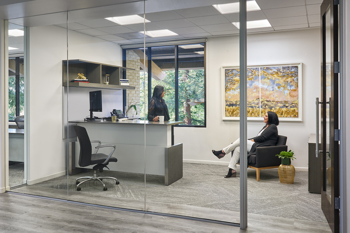 一楼是指定的“交易场所”,可轻松容纳大小团体会议。它被设计成一个会议中心,包括一个被会议室包围的“舒适”休息空间。董事会会议室设有白板可移动墙,提供扩展空间的机会。每个会议室都有完整的音频/视频功能,包括受控照明和窗帘。#办公室装修案例#