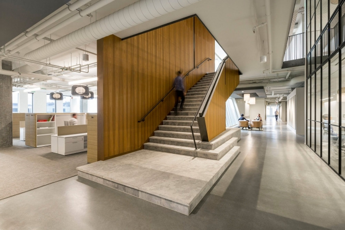 一条宏伟的“木板路”用于组织空间,将客人从主大厅和接待处吸引到陈列室和模拟商店以及协作工作区。木板人行道上的休闲座位区为非正式聚会提供了机会。自然光通过充足的外部玻璃窗涌入办公室,最显着的是通过三个大型全玻璃监视器,这些监视器投射到流通空间中,并在视觉上将每一层楼与下面的市场大厅连接起来。
