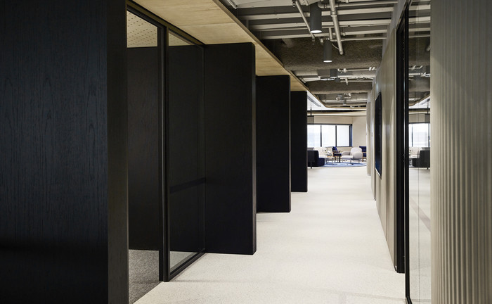 凹槽混凝土墙与天鹅绒家具内饰也形成了对比;在人流量大的区域,山羊毛地毯紧靠硬质石英地毯。#现代化办公室装修#