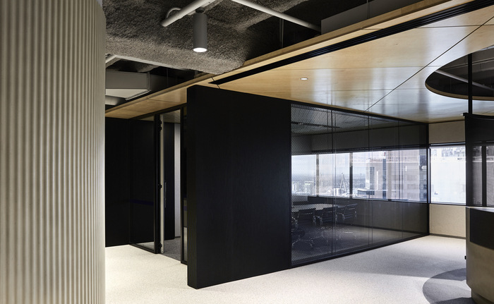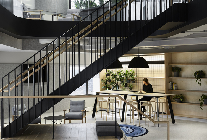在整个项目中,混合了原始和精致。裸露的管道系统和天花板服务由温暖的木材和织物镶板平衡。电梯大堂的镜面天花板在低矮的天花板空间中创造了高度,叶片墙和网格靠在弯曲的形式上,以便人们在圆形地板中定位自己。
