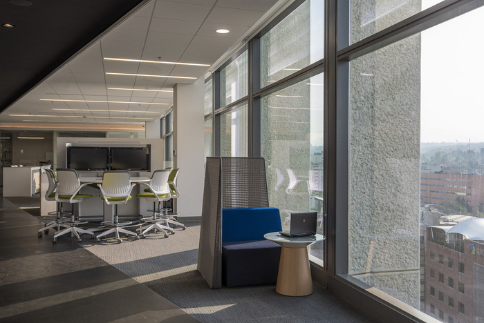 以与内部的立面关系和更好地利用自然光为出发点,除了平面图的矩形配置外,该项目还解决了沿整个布局相交的两个主轴。产生由中心的服务核心连接的四个分开的协作区域。#办公室设计图#