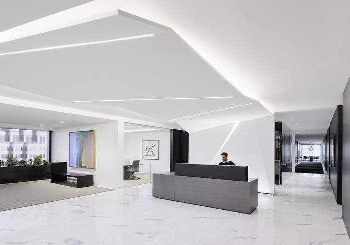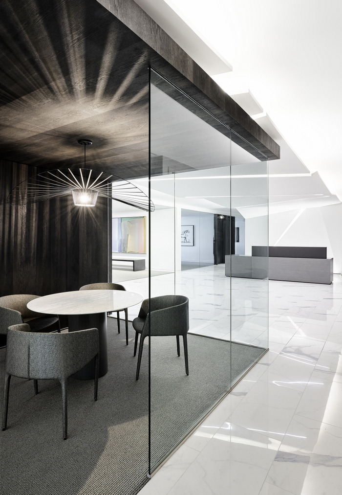 设计团队提议的白色、灰色和黑色调色板作为他们大量艺术品收藏的中性背景,并提供了戏剧性的照明机会。配色方案不仅描绘了字面上的对比,而且象征性地转变了他们最近离开渡轮大楼的更传统的法律环境。